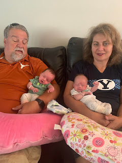This morning we got up and headed up to D&M house around 9:30 am. Spent all day there playing with Ellie and DJ, dad held Emory or Amelia almost all day long. We did lots of prep stuff...cleaning the back porch, washing windows, Kayla made a balloon arch, cooking ground beef, cutting tomatoes etc for taco bar. It was a very tiring but fun day. Love playing with the twinners.